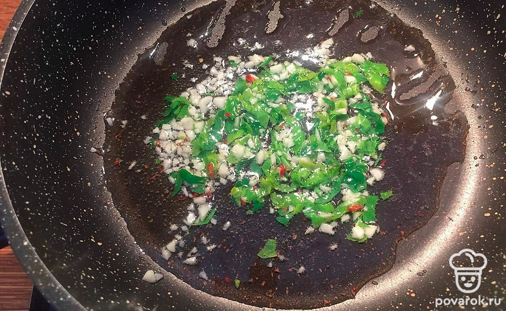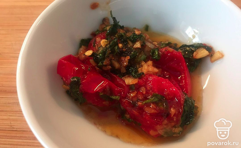 На растительном масле обжарим чеснок, через 3 минуты добавим петрушку и натрем перец. Добавим один помидор, который тоже потушим в течение пары минут до мягкого состояния.
