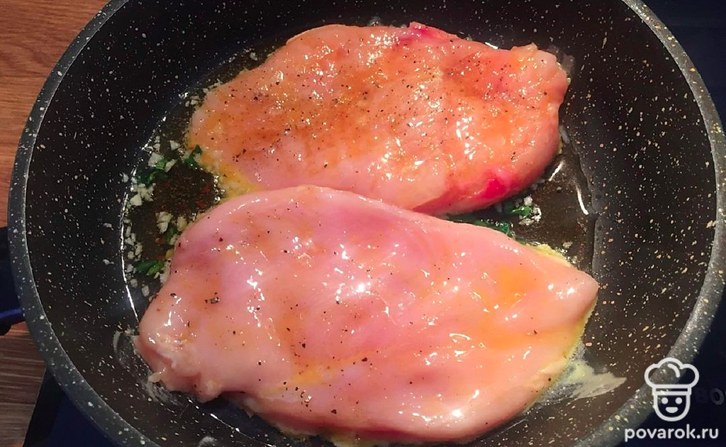 На другой сковородке приготовим куриную грудку: посыпаем ее перцем и солью, окунаем в яйцо.
