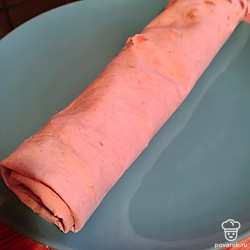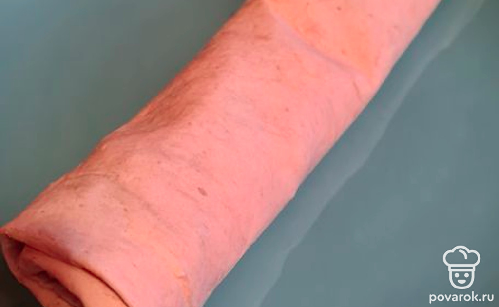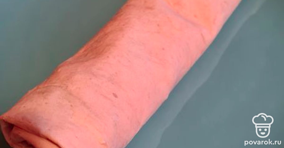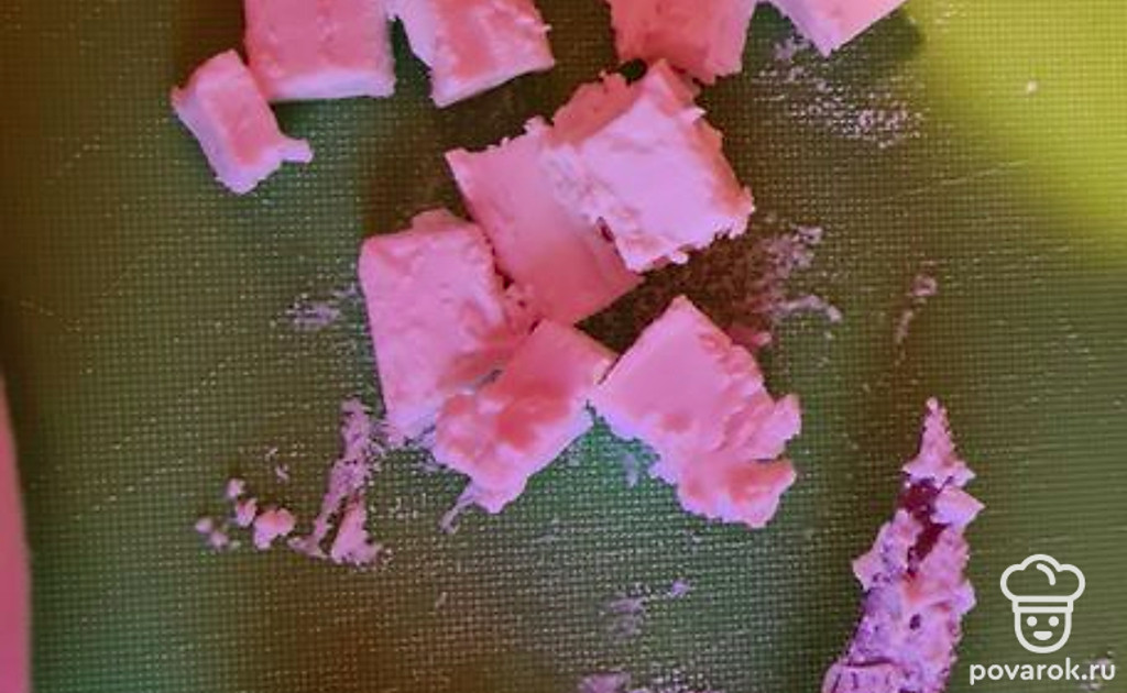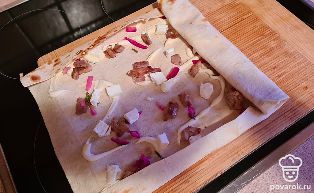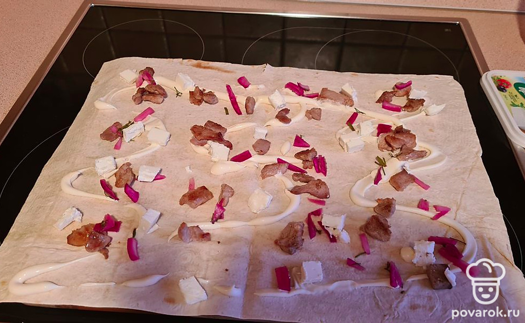 На лаваш выкладываем свинину, лук, брынзу и майонез.