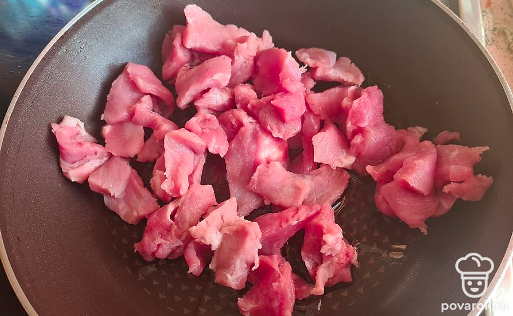 Обжариваем нарезанную кусочками свинину до румяного цвета (минут 15).