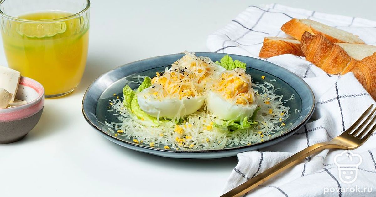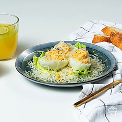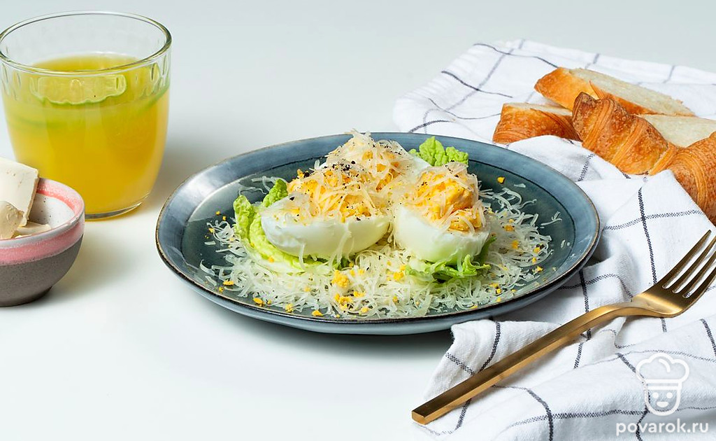 Подавайте фаршированные яйца на блюде, застеленном листовым салатом.