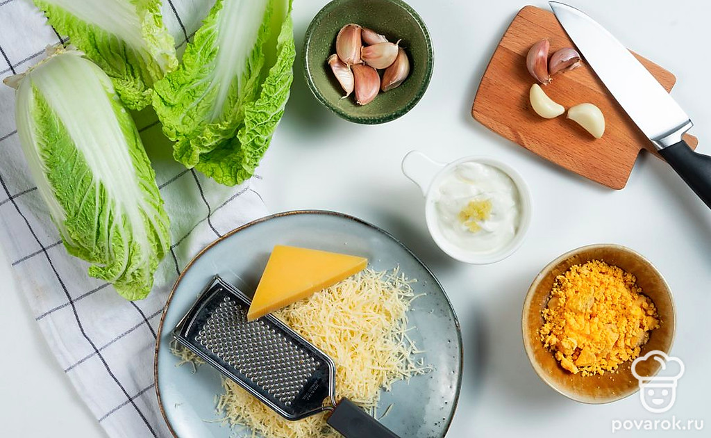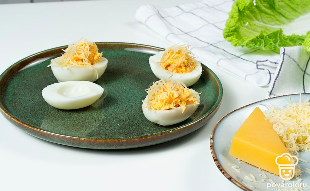 Приготовьте начинку. Смешайте майонез и пропущенный через пресс чеснок. Разомните желтки вилкой, добавьте к ним тертый сыр и немного соуса для вязкости.