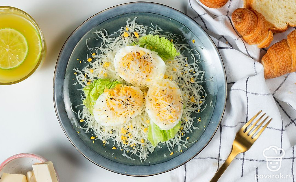Отварите яйца вкрутую в течение 8 минут после закипания на небольшом огне. Остудите, почистите и разрежьте вдоль. Достаньте желтки. Сыр натрите на мелкой терке. Почистите и помойте чеснок, пропустите его через пресс. Промойте, просушите и нашинкуйте базилик. Помойте и обсушите салатные листья.