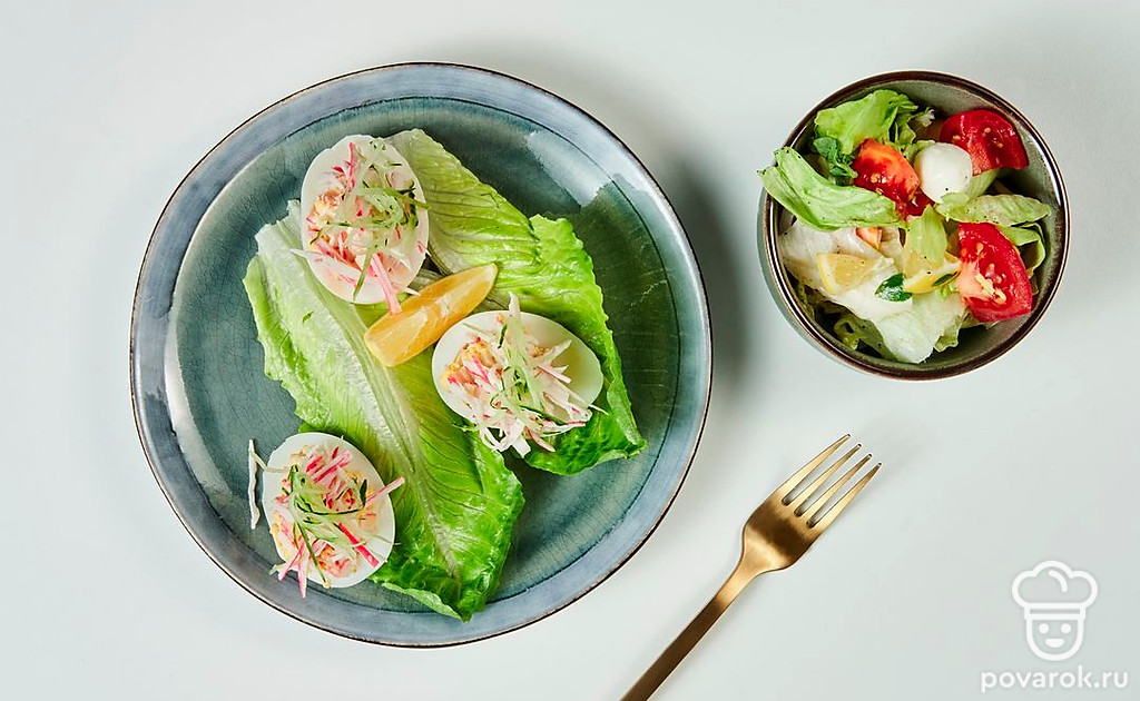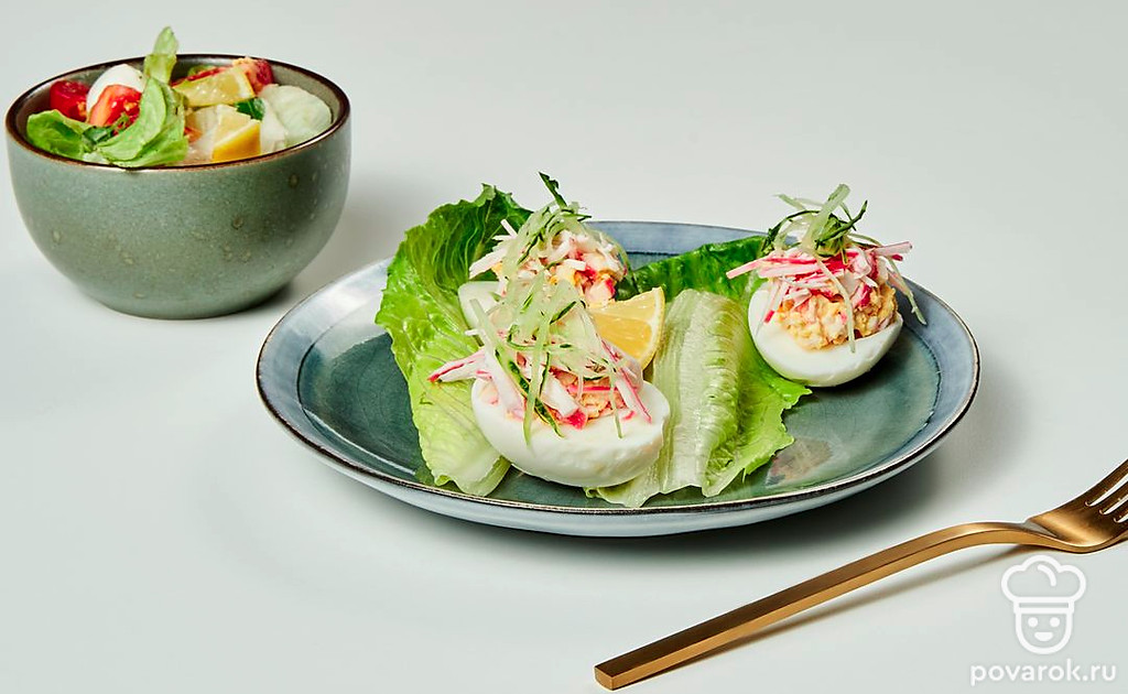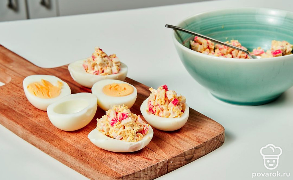 Яйца, фаршированные крабовыми палочками сможет приготовить даже начинающая хозяйка. Самый длительный процесс — варка яиц, займет максимум 10 минут. Пока готовится основной продукт, можно заняться начинкой. К крабовым палочкам можно добавить свежий огурец и консервированную кукурузу. Для дополнительной яркости и освежающего вкуса положите болгарский перец и зелень. Подавать фаршированные яйца к столу лучше после того, как они постоят в холодильнике хотя бы 15 минут.