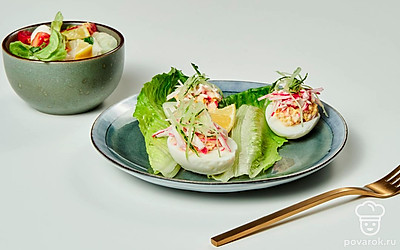 Подайте яйца, фаршированные крабовыми палочками, на сервировочной тарелке, застеленной листьями салата.