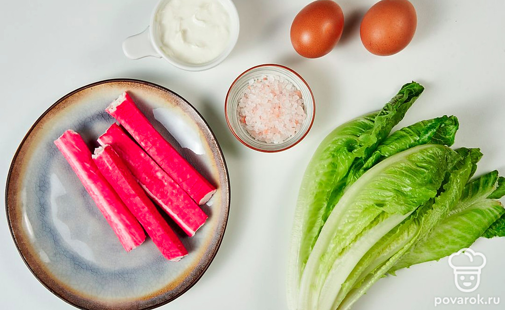 Куриные яйца вымойте, сварите вкрутую, остудите и почистите. Листья салата вымойте и обсушите. Крабовые палочки извлеките из индивидуальной упаковки.