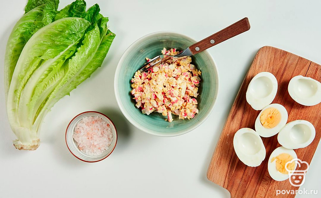 Приготовьте начинку. Яйца разрежьте вдоль пополам, извлеките желтки и натрите их на терке. Крабовые палочки мелко покрошите, смешайте с желтком, посолите и добавьте майонез.