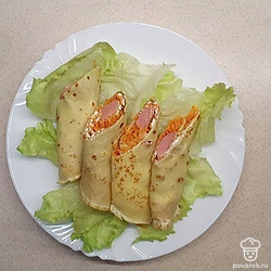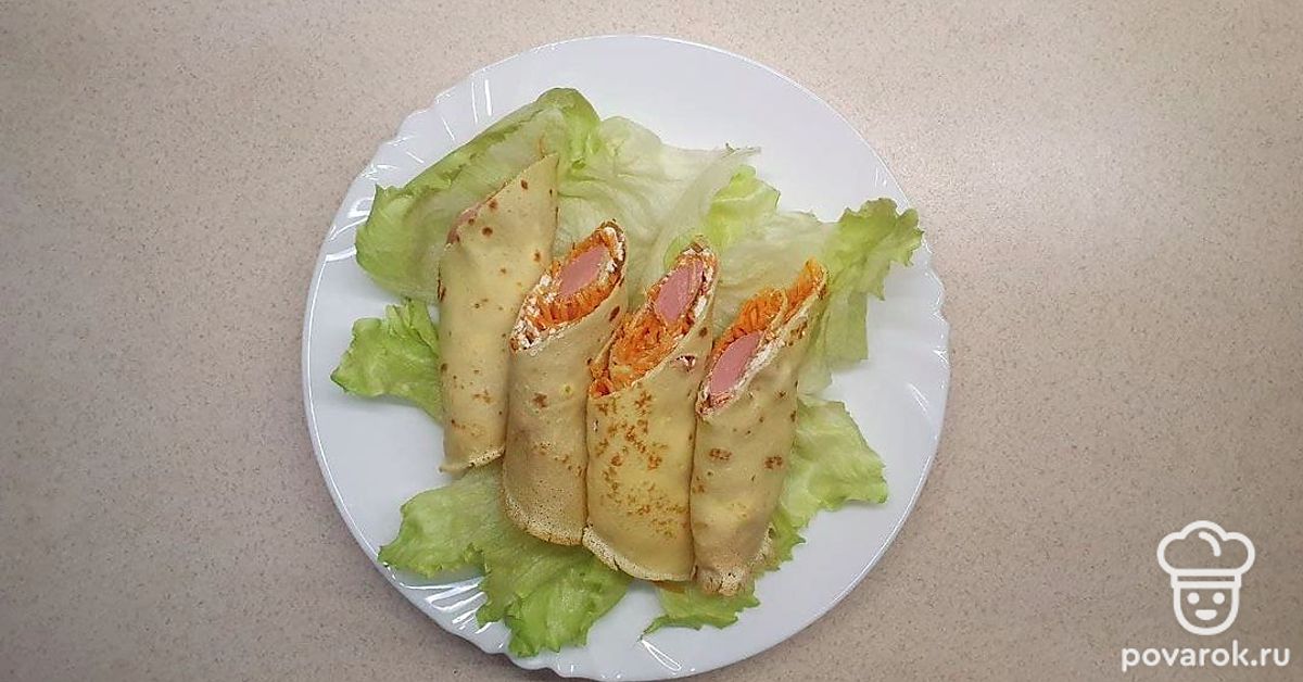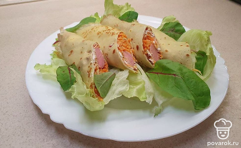 Каждый блин смажьте сыром фета, выложите горсть моркови по-корейски и сосиски. Блин с начинкой заверните в трубочку.