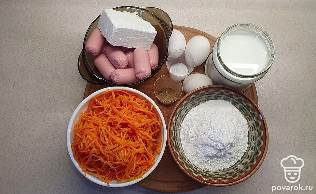 Подготовьте ингредиенты для приготовления блинов: яйца, выньте их из холодильника заранее, молоко и муку. Отмерьте нужное количество моркови по-корейски и сыра фета, отварите сосиски.