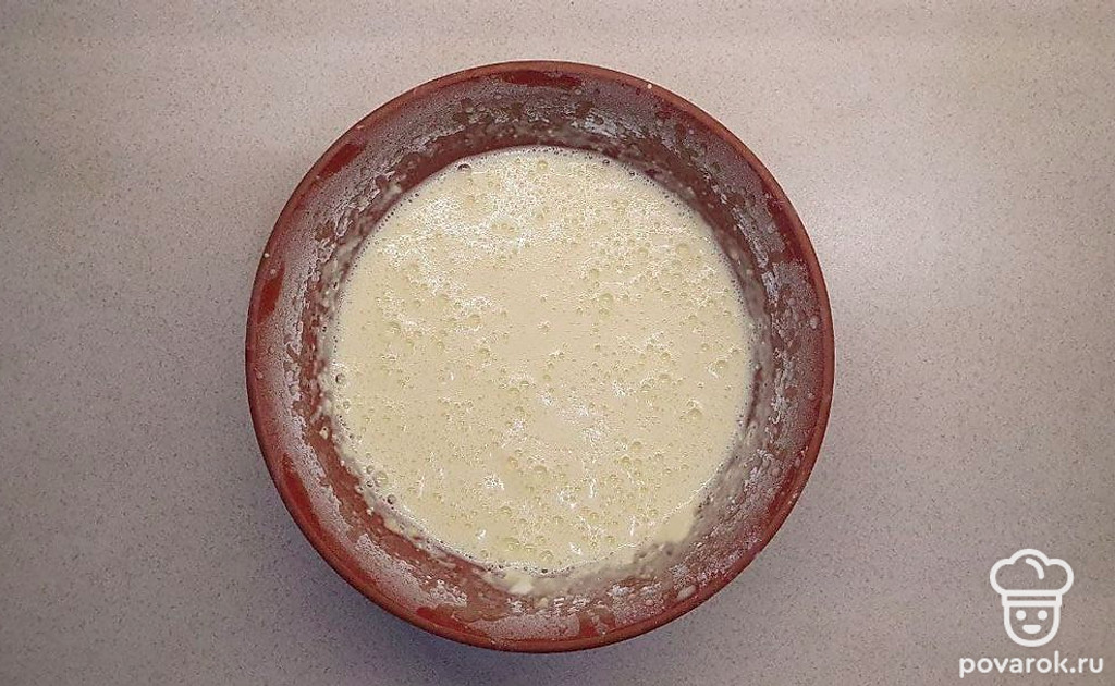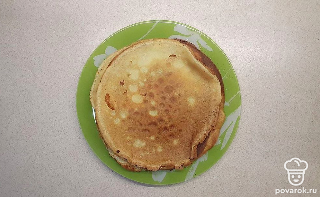 Из теста нажарьте блины, выливайте половник теста на разогретую сковороду и жарьте по 1-2 минуты с каждой стороны.