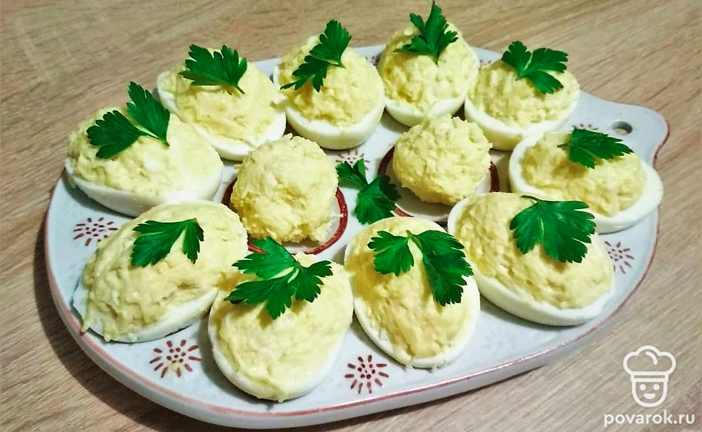 Фаршированные яйца — один из первых рецептов, которые начинают осваивать неопытные кулинары. Тем не менее это блюдо отлично подходит даже для праздничного стола, выглядит нарядно, а вариантов начинки существует великое множество, на любой вкус и кошелек. Классический вариант сырной закуски всего из трех ингредиентов: сыр, чеснок и майонез, прекрасно сочетается с отварными яйцами и готовится быстро и легко. Такое блюдо можно доверить готовить даже детям, они всегда будут рады помочь.
