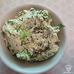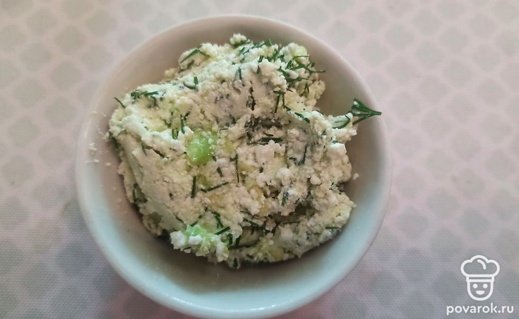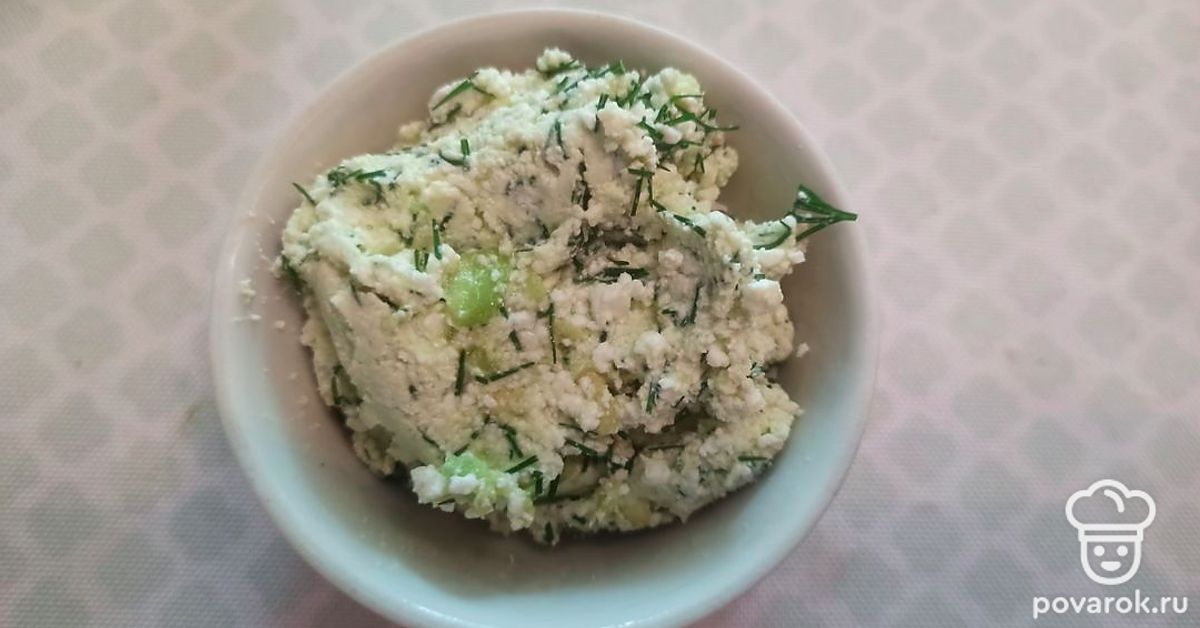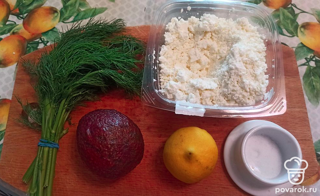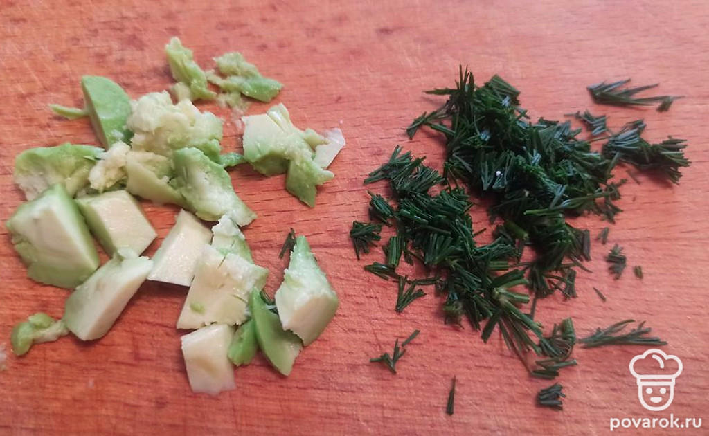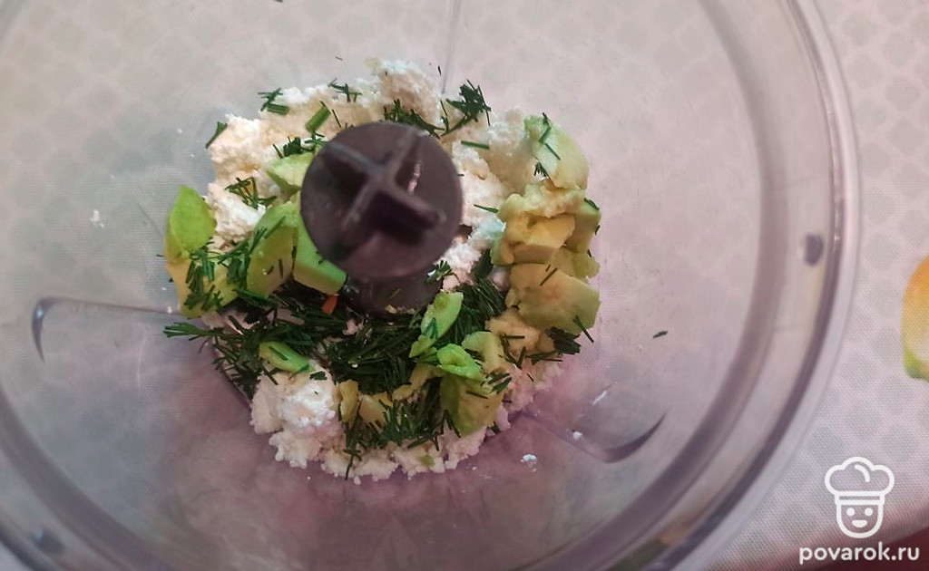В чаше блендера смешиваем творог, авокадо, укроп.