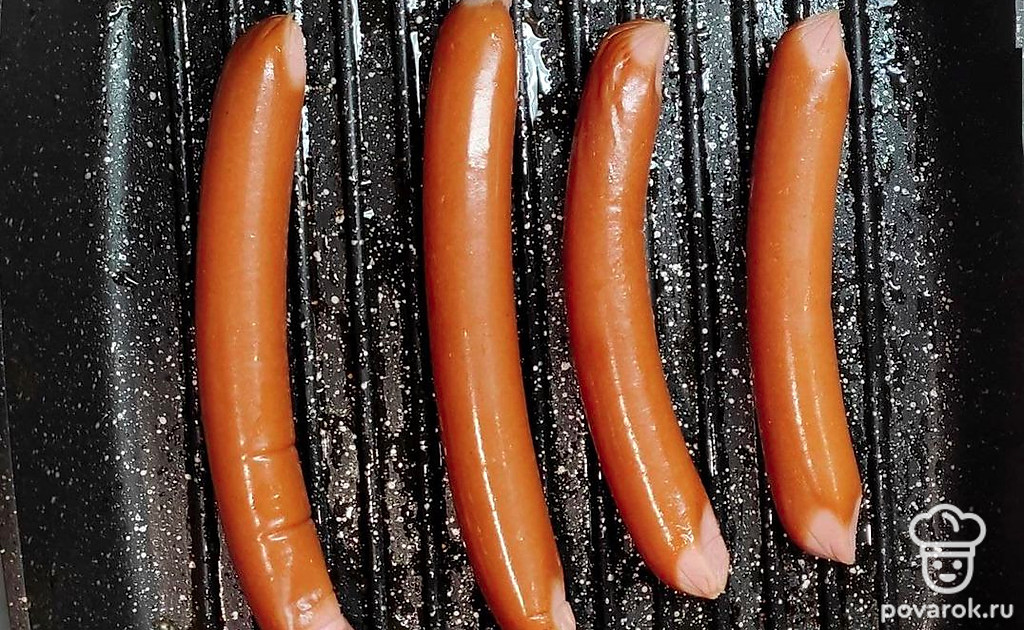 На разогретую сковороду выложите сосиски и обжаривайте с двух сторон до золотистого цвета.