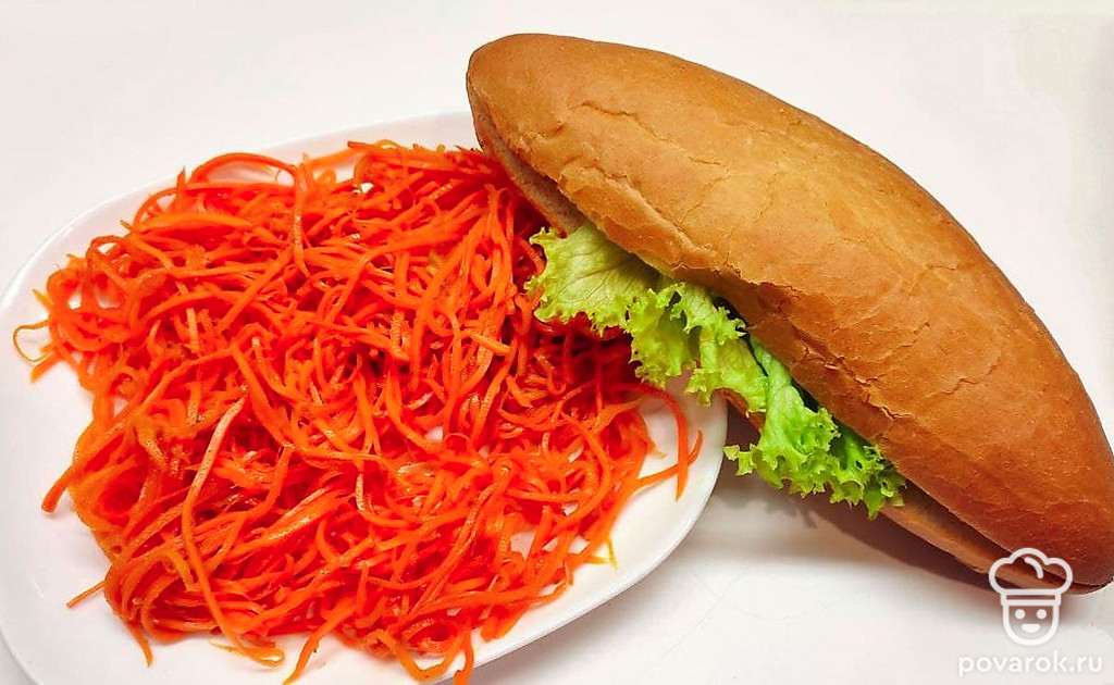В готовую булку ставьте лист салата, затем корейскую морковь, и капусту. Сверху положите сосиску и заправьте соусом.