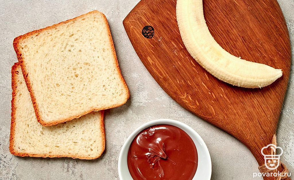 Соберите тост с шоколадной пастой. Возьмите один ломтик поджаренного хлеба, смажьте его шоколадно-ореховой пастой, выложите на нее кружочки бананов и накройте вторым ломтиком хлеба.