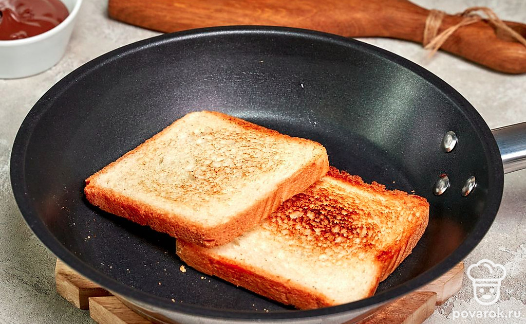 Пожарьте тосты. Сковороду поставьте на огонь и выложите на нее ломтики хлеба. Обжаривайте хлеб с обеих сторон до румяной и хрустящей корочки.