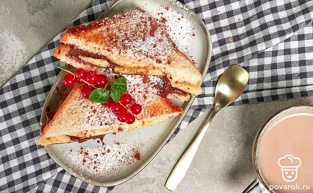 Тост разрежьте по диагонали и посыпьте сахарной пудрой перед подачей.