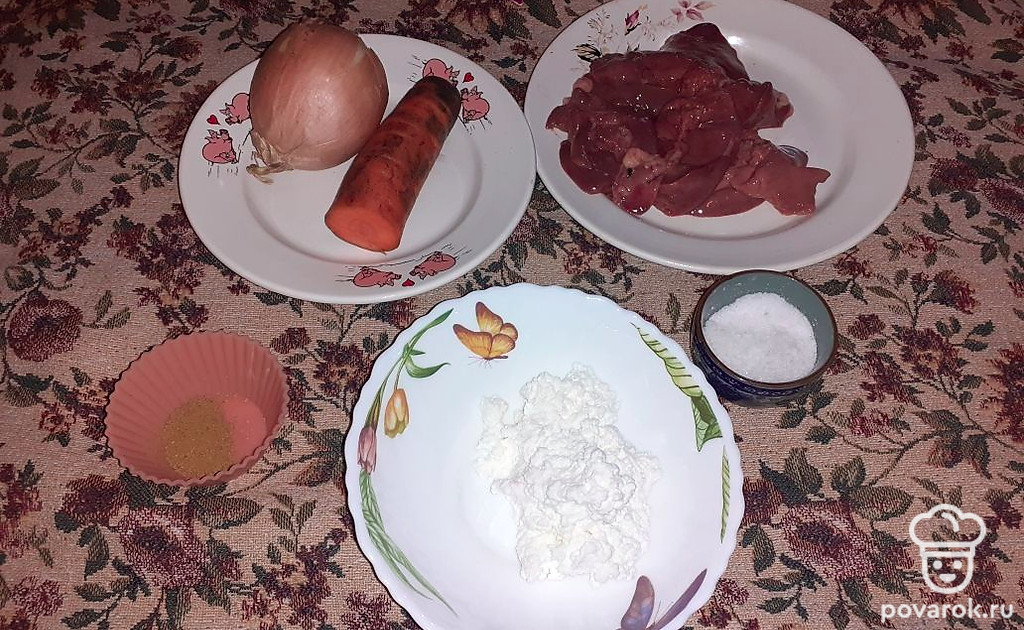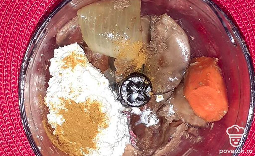 Готовые печень и овощи остудите, выложите в чашу блендера с творогом и карри и взбейте. Можно перекрутить 2 раза через мясорубку.