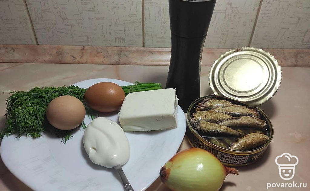 Отварите и остудите яйца, нарежьте их произвольно. В блендере измельчите лук, добавьте яйца и шпроты, мелко нарезанный укроп и натертый плавленый сыр.