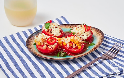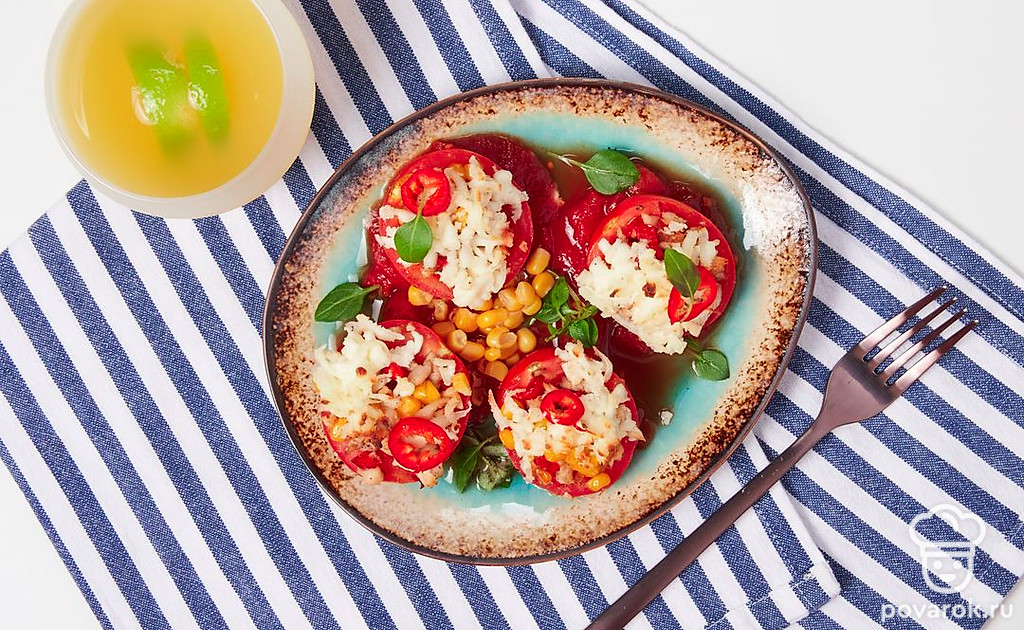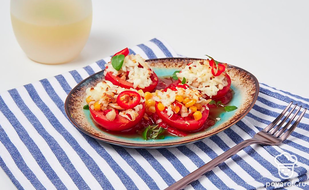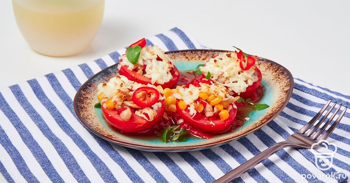 Закуска из фаршированных помидоров с курицей — интересный и вкусный вариант блюда, в котором нежное филе отлично гармонирует с сочными овощами. Изюминкой закуски является кукуруза, которую добавляют к начинке в самом конце приготовления. Она придает блюду приятный вкус и делает его еще питательнее. Готовую закуску подайте к столу порционно, выложив ее на листья салата и украсив рубленой зеленью.