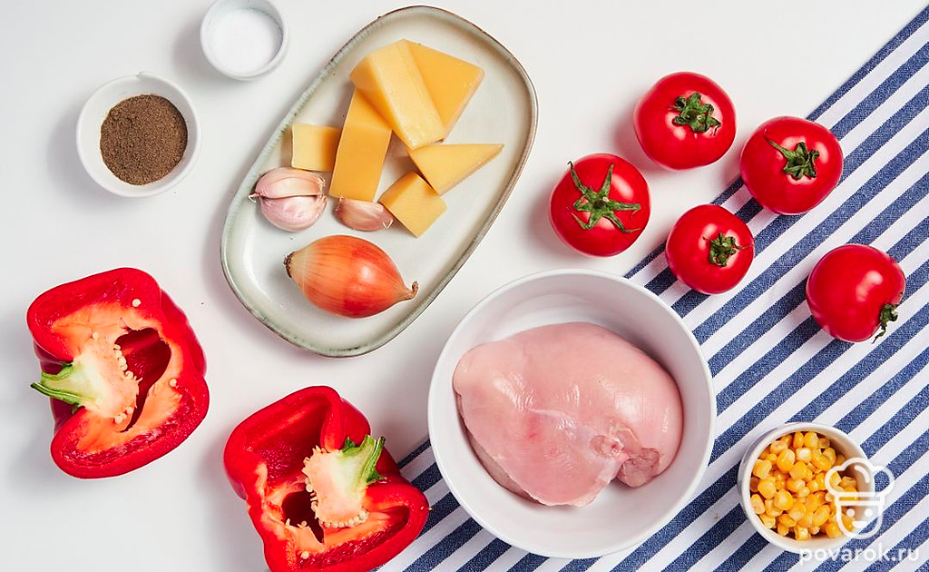 Филе тщательно промойте, просушите бумажными полотенцами и очистите от жилок и пленки. Овощи хорошо вымойте. Чеснок и лук очистите от шелухи. Кукурузу переложите в миску, жидкость слейте. У помидоров срежьте верхушки и извлеките мякоть. Сыр натрите на терке. Также возьмите сковороду и форму для запекания.