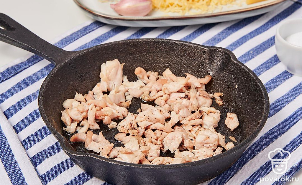 Начните приготовление начинки. Сковороду поместите на средний огонь, добавьте немного растительного масла и оставьте разогреваться. Пока масло греется, нарежьте куриное филе небольшими кусочками или кубиками. Затем выложите мясо на сковороду, посолите, поперчите и обжарьте в течение нескольких минут, периодически помешивая. После этого снизьте огонь на минимум и оставьте филе готовиться.