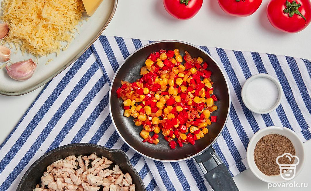 Приготовьте начинку. Болгарский перец очистите от плодоножки и семян, нарежьте мелкими кубиками. Аналогично нарежьте репчатый лук. Добавьте нарезанные овощи к куриному филе, перемешайте и оставьте готовиться. Затем измельчите чеснок и добавьте к остальным ингредиентам. Обжарьте начинку еще 3-4 минуты, тщательно перемешивая. В конце добавьте в сковороду кукурузу, перемешайте, подержите на минимальном огне еще несколько минут, после чего снимите с плиты.