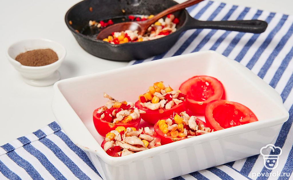 Приготовьте закуску. Наполните помидоры готовой начинкой из овощей и курицы до самого верха. Посыпьте тертым сыром. Переложите фаршированные помидоры в форму и поместите в духовку. Запекайте закуску в течение 10 минут при температуре 190 градусов. Затем снизьте температуру до 170 градусов и оставьте помидоры готовиться еще на 15 минут.