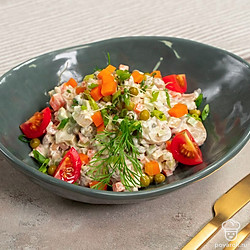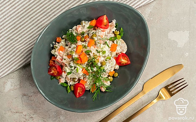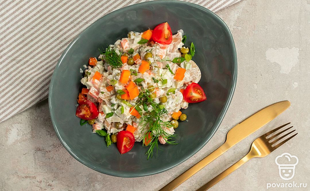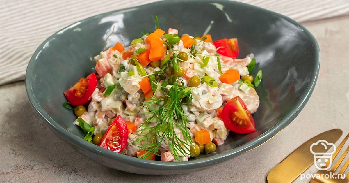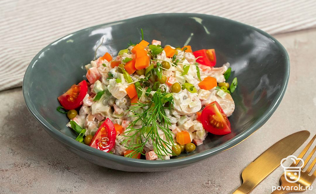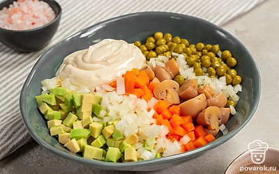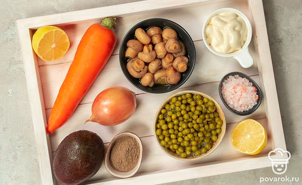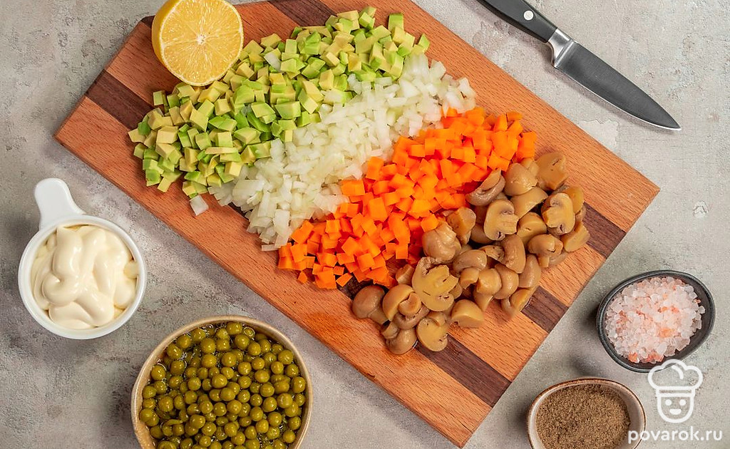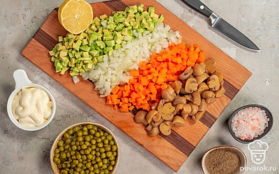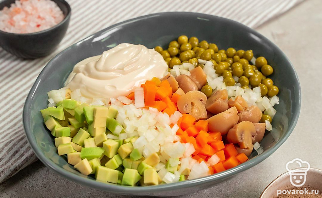 Постный оливье с авокадо и маринованными грибами — блюдо для тех, кто придерживается православных традиций или не употребляет продукты животного происхождения. Маринованные грибы подойдут любые — например, шампиньоны. Желательно приобретать продукт в стеклянной таре, так можно увидеть ее содержимое. Авокадо выбирайте с гладкой упругой кожицей, сухой и темной плодоножкой. Для более пикантного вкуса в салат можно добавить лимонную цедру.