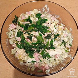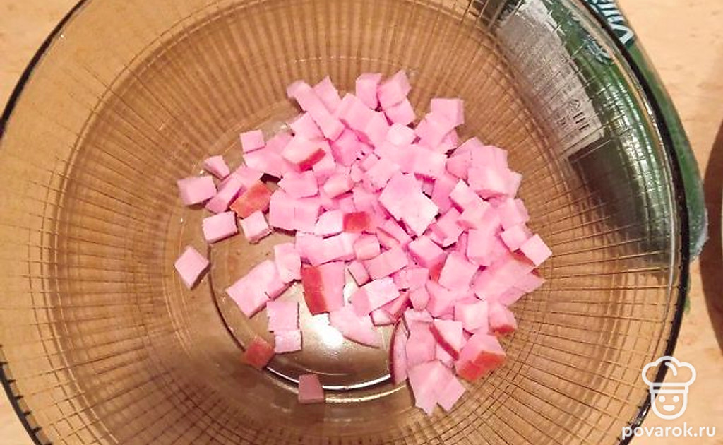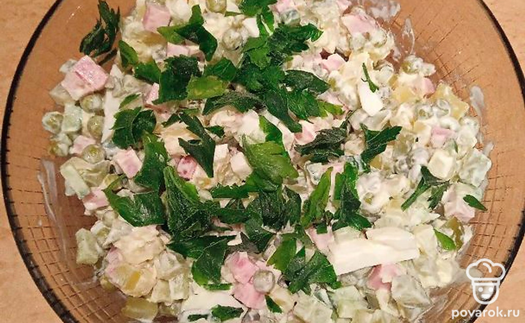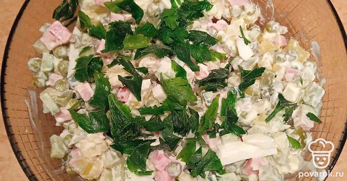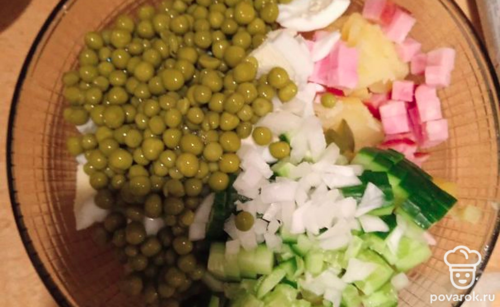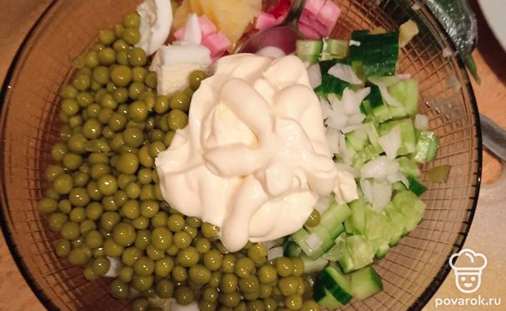 В конце добавьте горошек и мелко нарезанный репчатый лук.