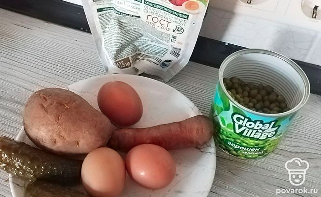 Подготовьте все ингредиенты. Морковь, картофель и яйца отварите.