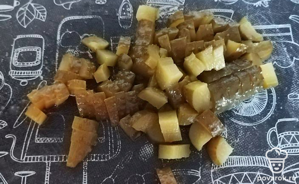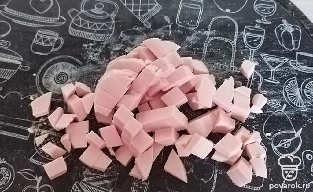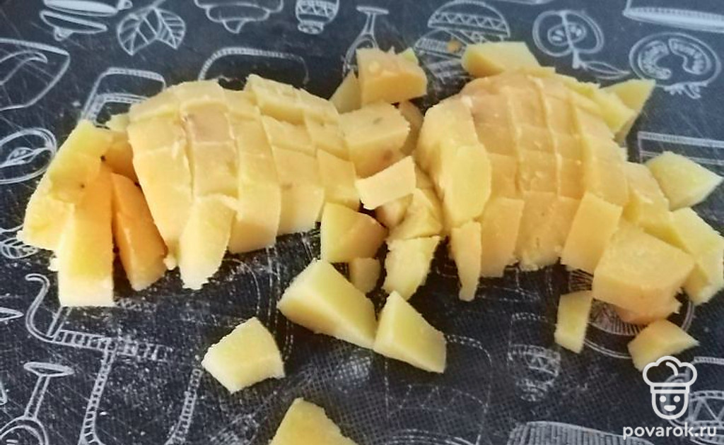 Нарежьте кубиками яйца. Старайтесь, чтобы все ингредиенты были одного размера.