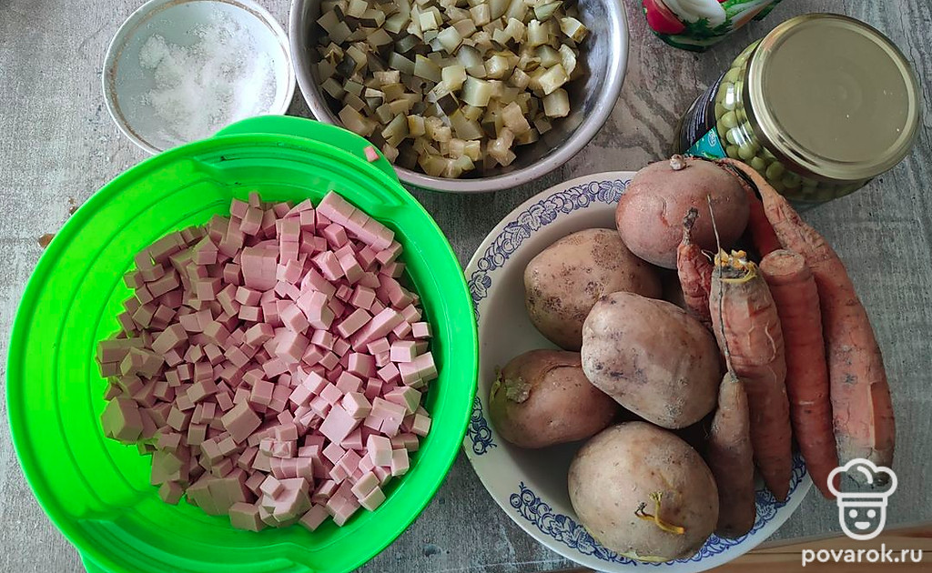 Подготовьте необходимые ингредиенты. Заранее отварите картошку, яйца и морковь.