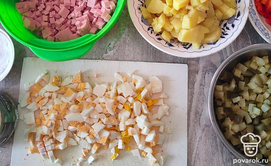 Накрошите все ингредиенты, кроме зеленого горошка, кубиками.