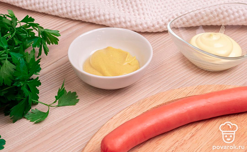 Подготовьте необходимые ингредиенты. Сосиску очистите, отмерьте нужное количество горчицы и майонеза.