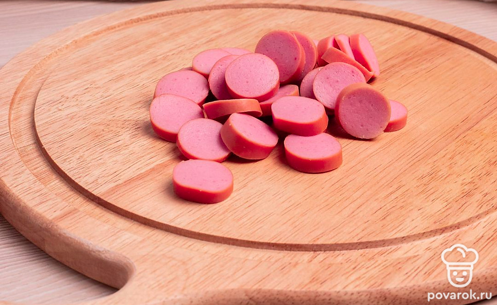Сосиску порежьте на небольшие кружочки. Примерно 3-4 см.