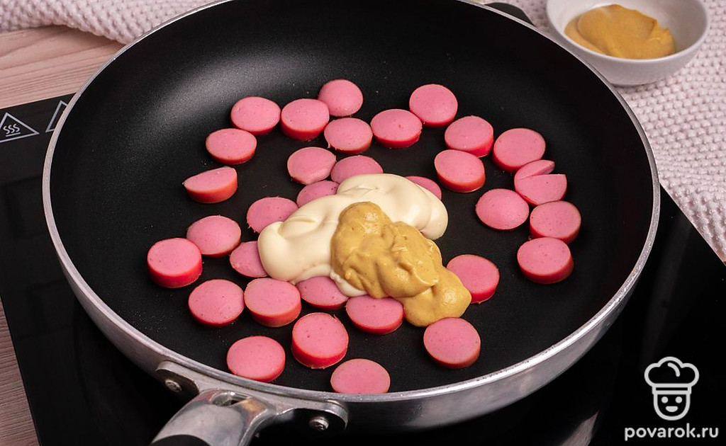 Сковороду поставьте на огонь. Добавьте немного масла и затем выложите сосиски. Размер сковороды лучше подобрать такой, чтобы сосиски поместились в один ряд. Так они лучше зарумянятся. Затем добавьте майонеза и горчицы , перемешайте.