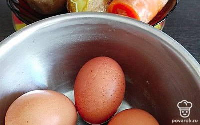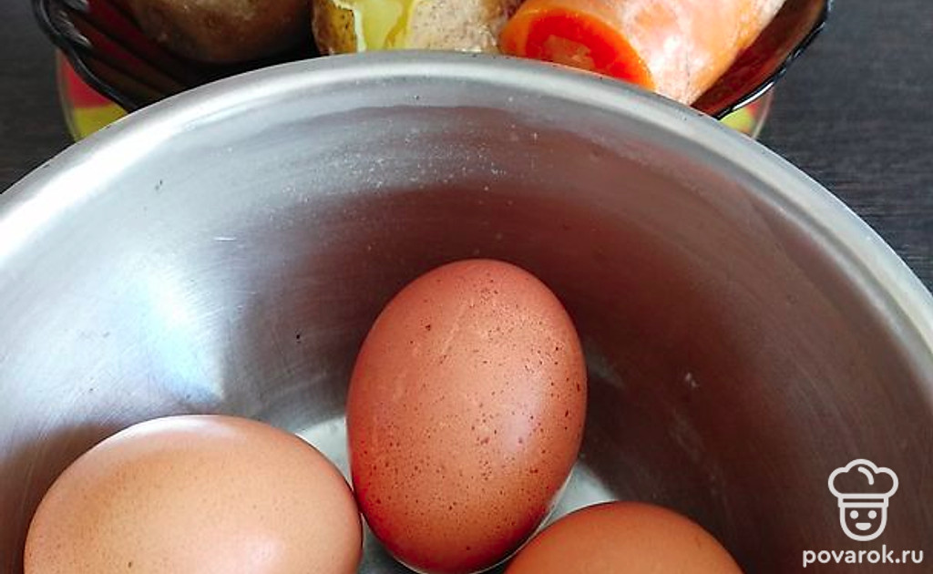 Овощи и яйца отварить, остудить и очистить от кожуры.