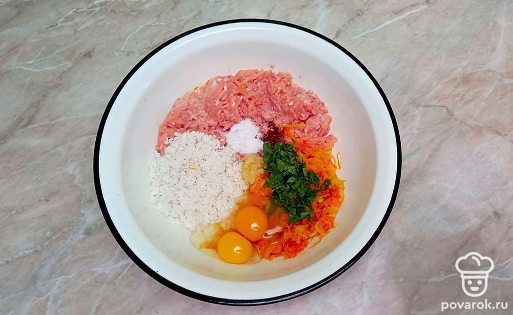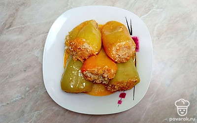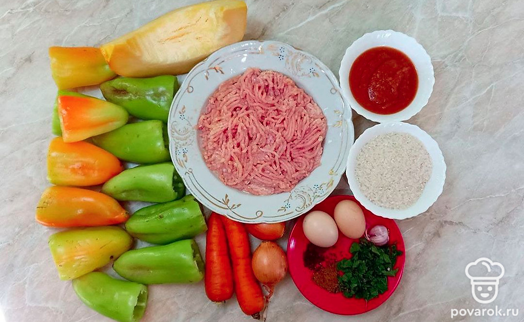В миску положите фарш, соль, специи, рис, яйца и поджаренные овощи. Перемешайте и начините полученной смесью перец.