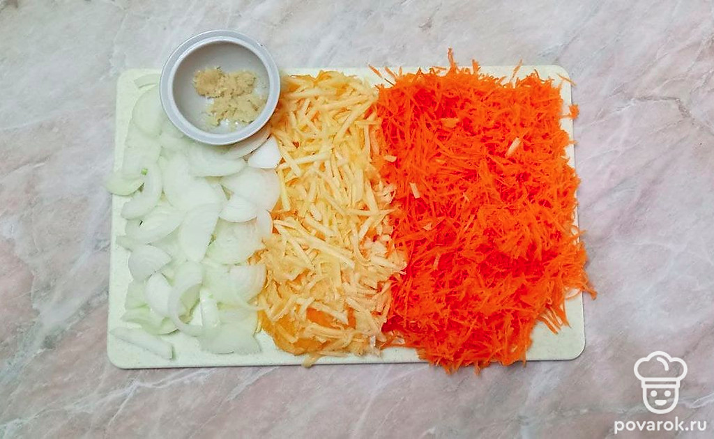 Почистите лук и нарежьте его полукольцами, а морковь и тыкву натрите на крупной терке. Чеснок пропустите через пресс.