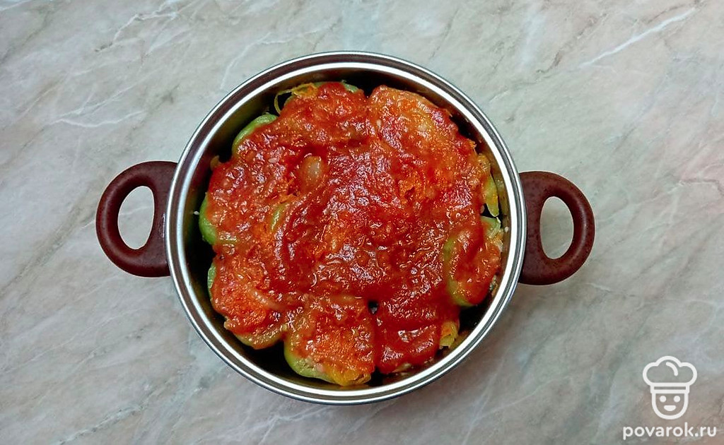 Сверху выложите часть поджаренных овощей и томатный соус. Добавьте воду, она должна быть немного ниже перца, примерно на 1.5-2 см. И варите на минимальном огне в течение 45-50 минут.