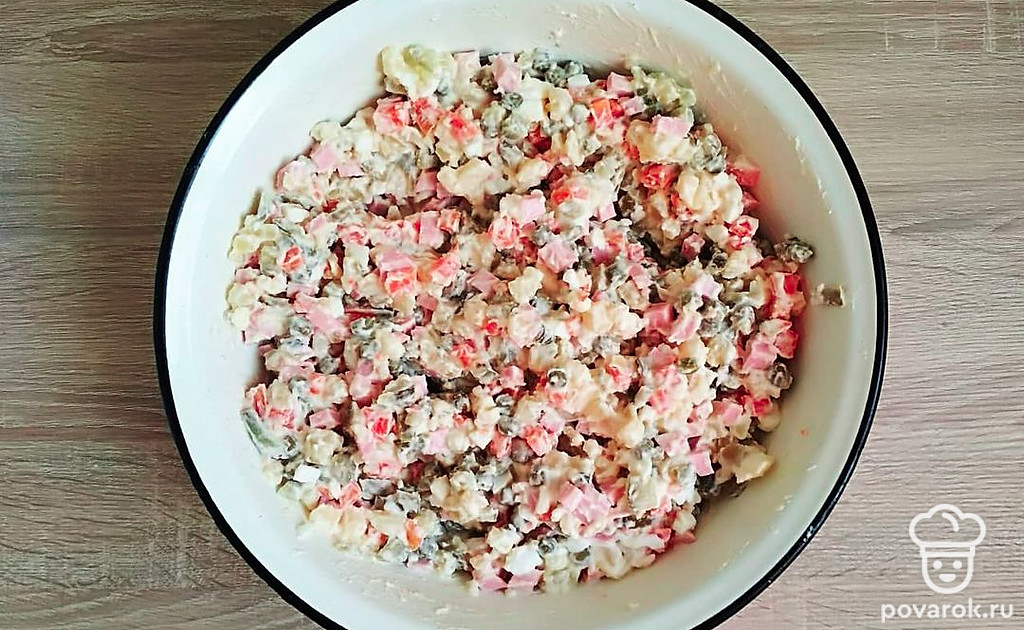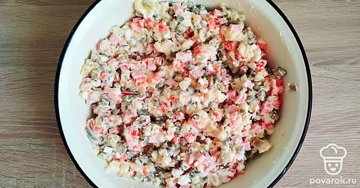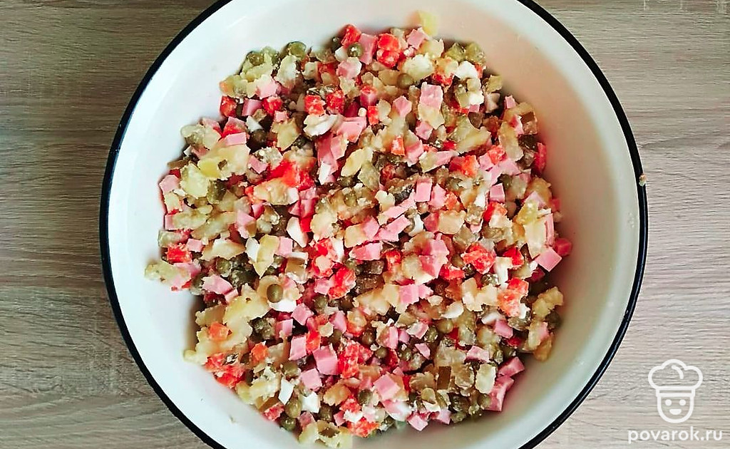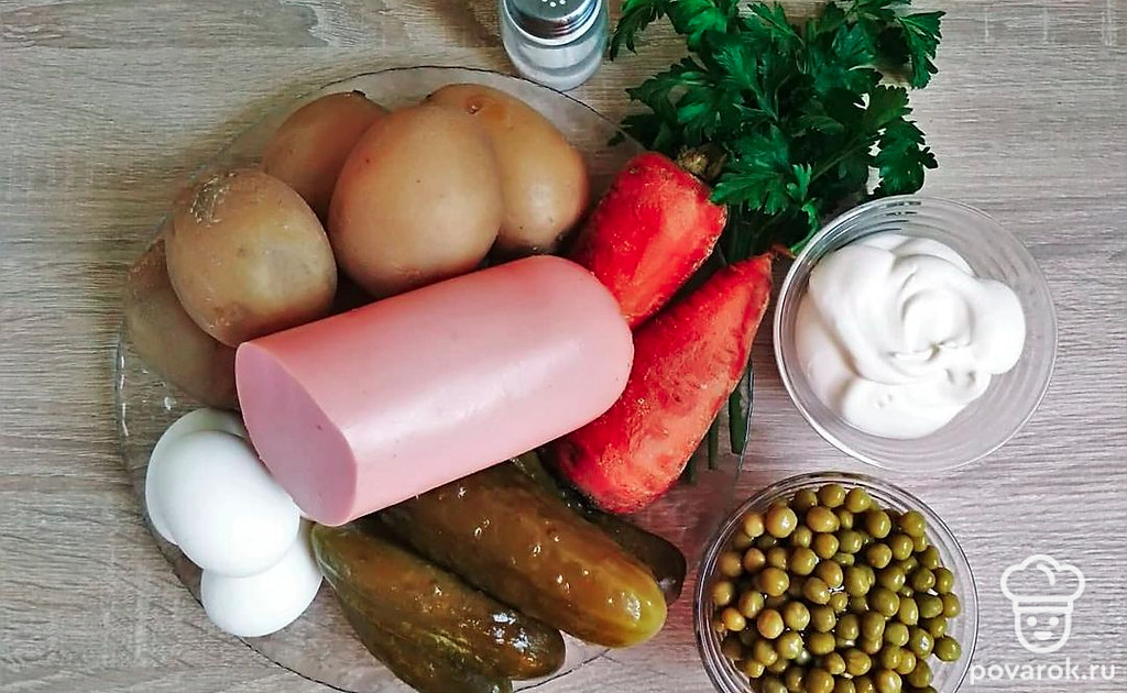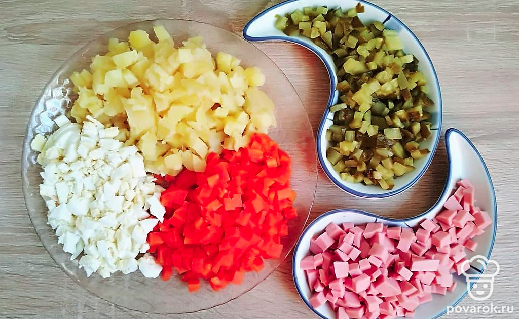Традиционный и любимый салат "Оливье", который очень прост в приготовлении, и любая хозяйка справиться с ним, чтобы побаловать своих близких и гостей самым вкусным в мире салатом. Залогом успешно приготовленного салата, является правильно подобранные и сочетаемые ингредиенты. Вареная колбаса обязательно должна быть свежей и качественной. Выбирайте докторскую или молочную колбасу. Горошек берите мозговых сортов, именно этих сортов он более нежный и сладкий. Майонез выбирайте более жирный, так как от него зависит основной вкус салата.