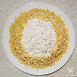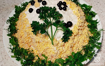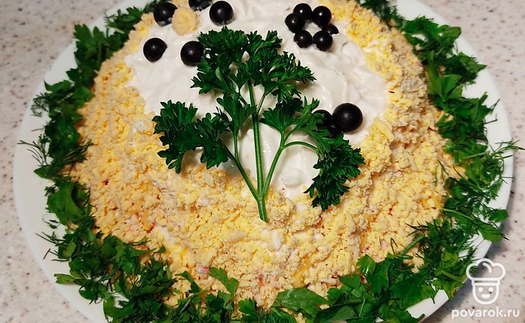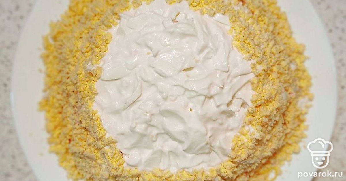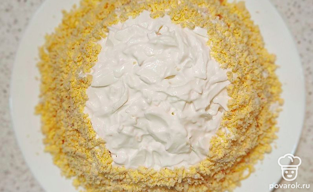 Белки смешайте с оставшимся майонезом и распределите сверху по поверхности блюда. Посыпьте по кругу тертыми желтками. Готовое блюдо можно подавать к столу.