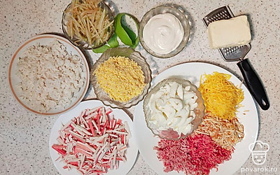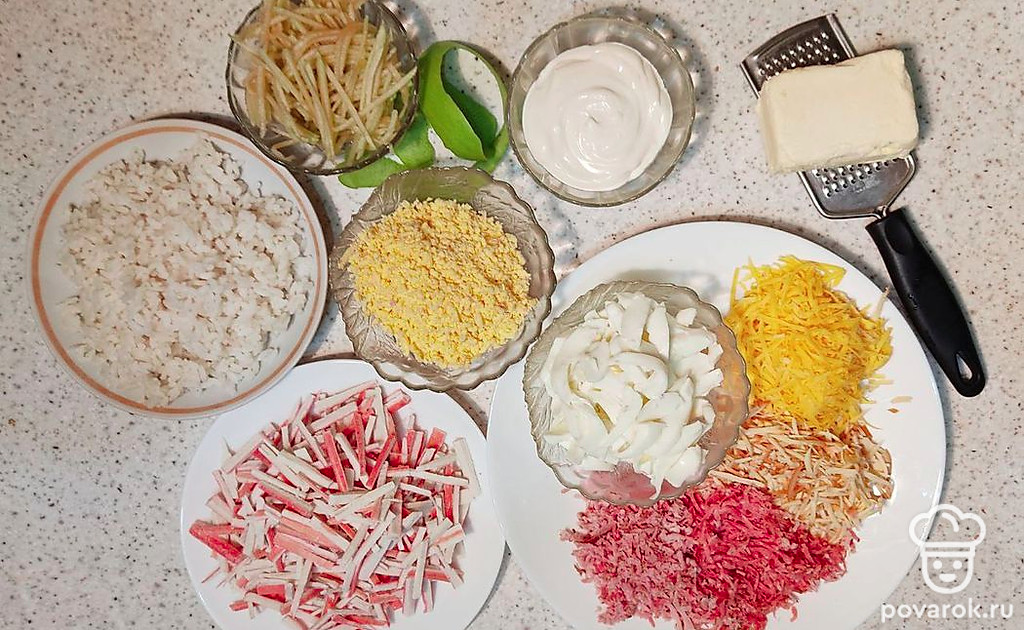 Возьмите несколько емкостей и распределите по ним все нужные продукты, отмерьте нужное количество. Отварите 100 г риса и остудите его, не переварите. Отварите яйца, отделите белки от желтков и натрите на мелкой терке. Крабовые палочки разрежьте пополам и порежьте вдоль, копчения натрите на мелкой терке и смесь сыров, яблоко натрите на крупной терке или терке для корейской морковки.