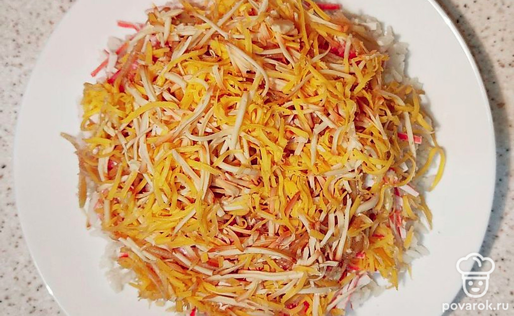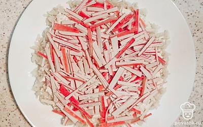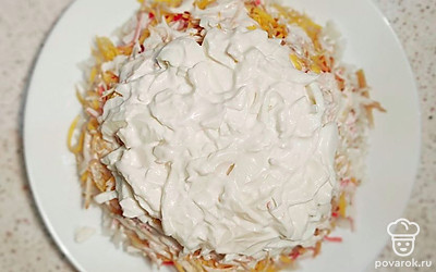 Первый идёт слой отварного риса, намажьте его майонезом. После слой порезанных крабовых палочек, на них мы натрите сливочное масло и распределите по всему диаметру.