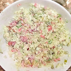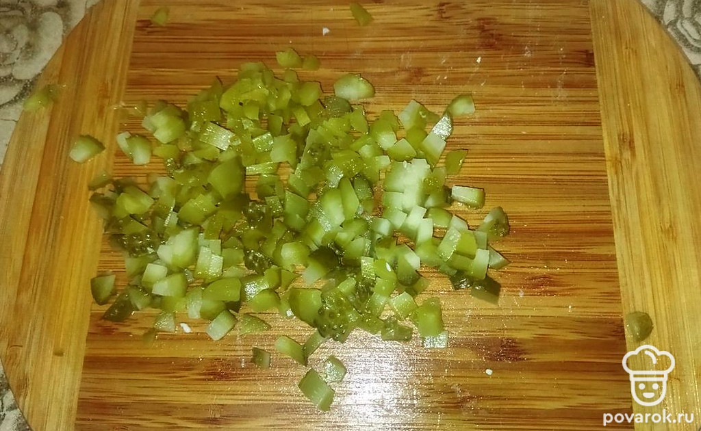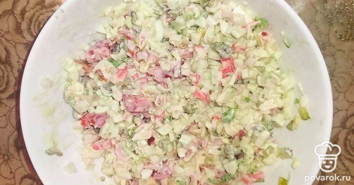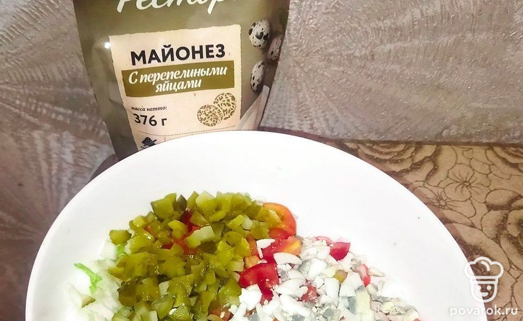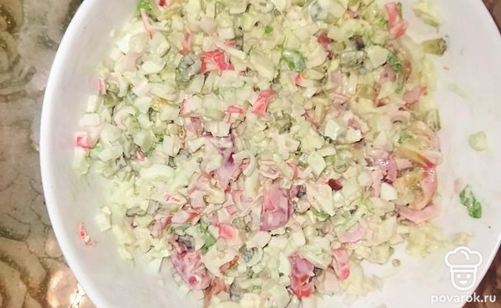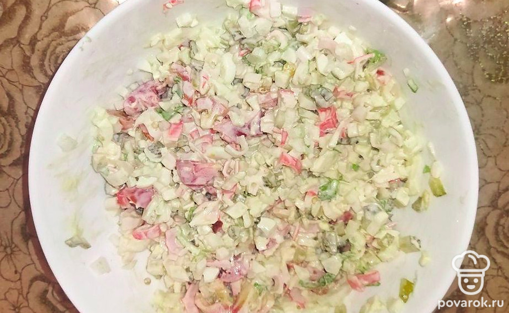 Переложите все ингредиенты в салатник и заправьте майонезом.