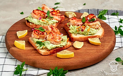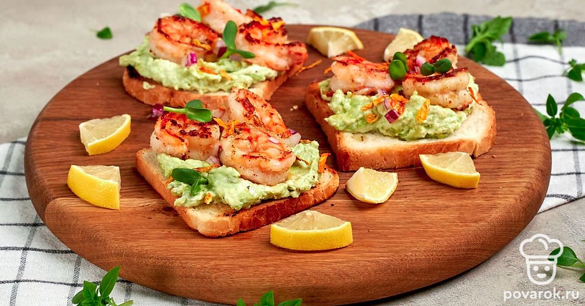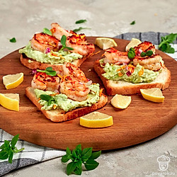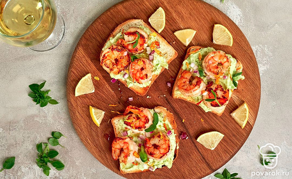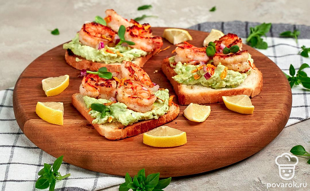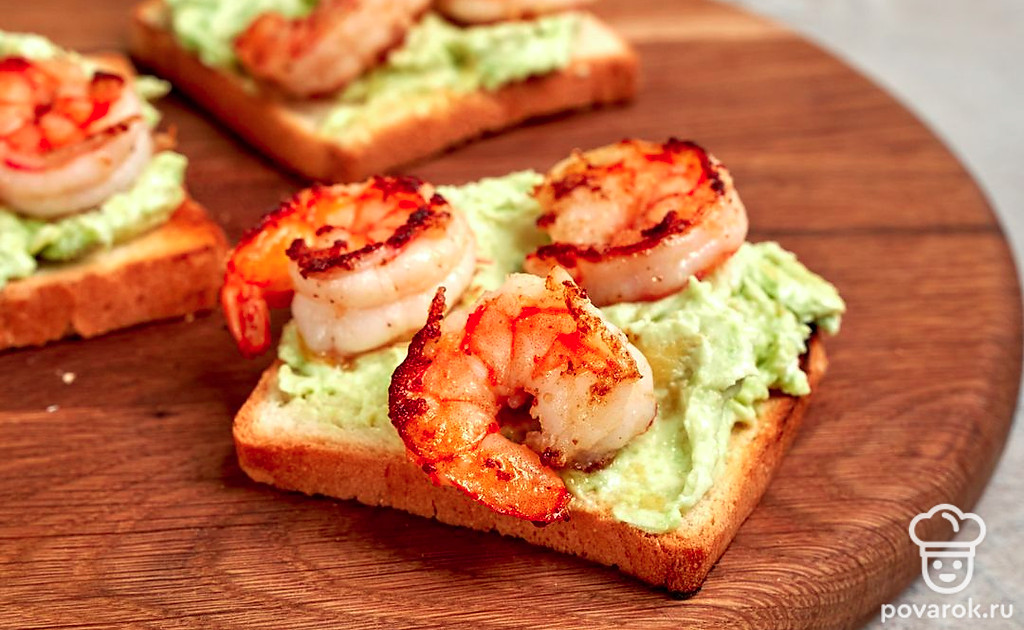 Тосты с тигровыми креветками — истинное украшение любого стола. Блюдо отлично подойдет для ужина за счет низкой калорийности креветок. Тосты станут необычной закуской к шампанскому, белому вину и другим легким напиткам. Креветки восхитительны на вкус и без других ингредиентов. Но в сочетании с авокадо и оливками они обретают новые приятные гастрономические оттенки.