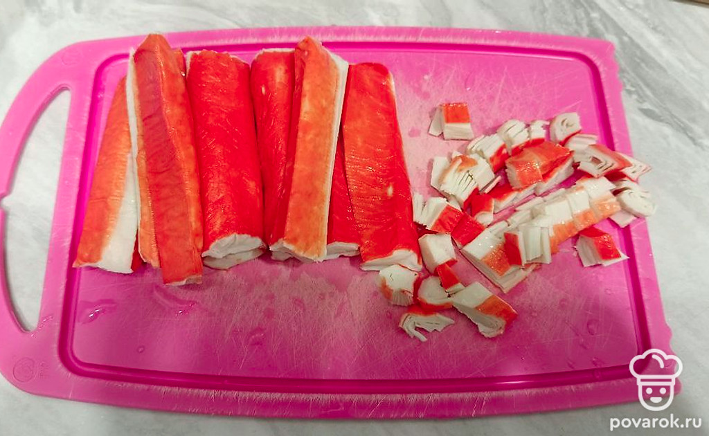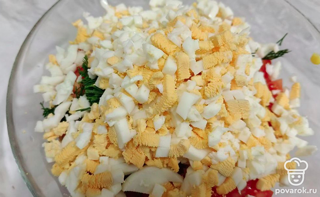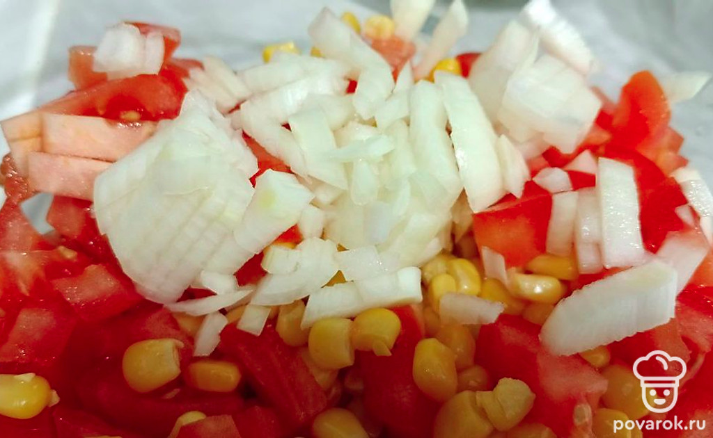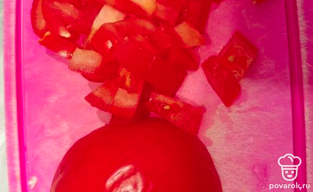 Помидор нарезать кубиками. Отправить к остальным ингредиентам.