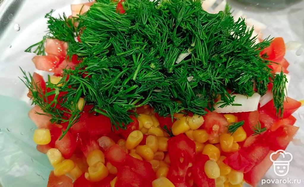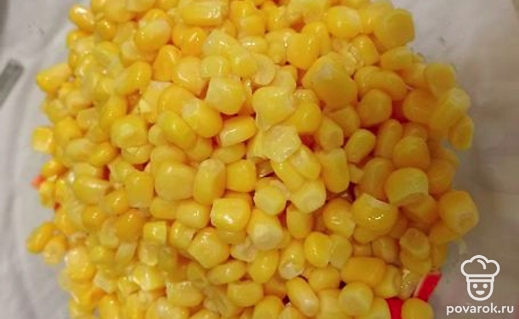 Консервированную кукурузу откинуть на дуршлаг и добавить в салатник.