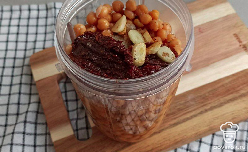 Загрузите в блендер нут, вяленые помидоры и чеснок и измельчите до состояния пасты. Переложите паштет в другую емкость.